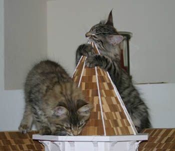 And then there's the dollhouse. If lisa-mom insists on having houses around that are just our size, then she should also accept that we're going to play in it. We fit perfectly through the doors and even through the windows. The furniture makes good toys -- and that silly pretend kitten that lives in there! Well! It is just stupid and deserves to be swatted out of the house every day. And just because Colyn likes to chew on the top of the house is no reason to say he's naughty. He's teething, okay? It's the same reason Colyn and Tori chomped the lamp shade.