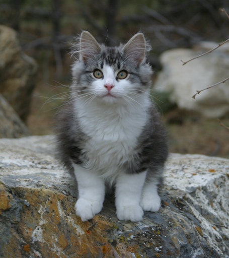 Shira is almost six years old. It's time she gets to retire and enjoy being The Queen of Everything full time instead of dealing with kittens, so this is her last litter. Two darling babies arrived on New Year's Eve. Zeta was a surprise as our vet only saw one baby in the xray. I guess she was hiding behind her bigger brother. Unfortunately Zeta wasn't healthy and she said goodbye much too soon. (Zeta can be seen on the In Memory page.) Fin has thrived and is staying at LostWoods to make babies of his own one of these days.
