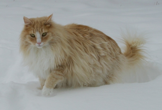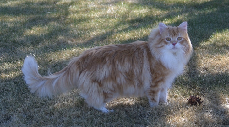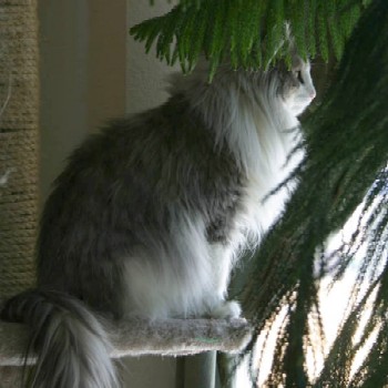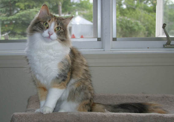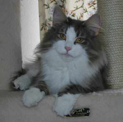 Kalira, aka Lira Bug, is one of our Travelers. She had conjunctivitis when she was young, so I held onto her extra long, wanting to make sure she'd be a healthy addition to someone's home. All along she was my son Justin's favorite kitten and somehow it just became a given that she'd be his cat forever. I finally registered her in both our names making it official. Lira has developed into a stunning girl with a fantastic coat and incredible boning. Lira was one of the featured Norwegian Forest Cats in the September 2005 issue of Cat Fancy magazine. She also inherited her Talia-mom's beauty queen presence. She's now retired from showing after earning a Regional Winner award in CFA, but you can see Lira's show results on the Show News page. She's a mighty bug hunter and begs to go outside so she can chase bugs in the back yard.
